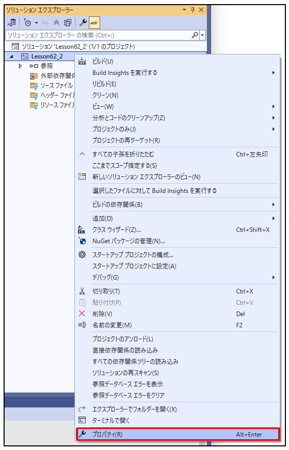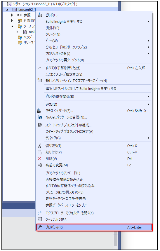1.Visual Studio 2022 で、コマンドライン引数を設定するには「プロジェクト」を右クリくしてプロパティを選択します。