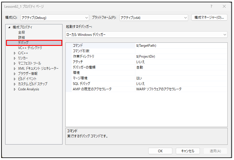 2.「構成プロパティ」の「デバック」をクリックします。
