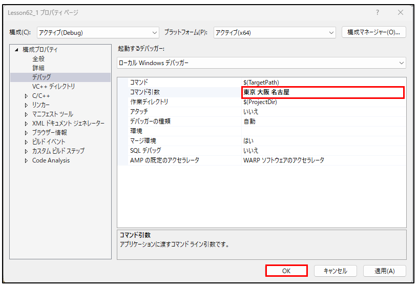 argv[0] : C:\Users\joeac\source\repos\Lesson62_1\x64\Debug\Lesson62_1.exe実行例2(コマンドライン引数あり)