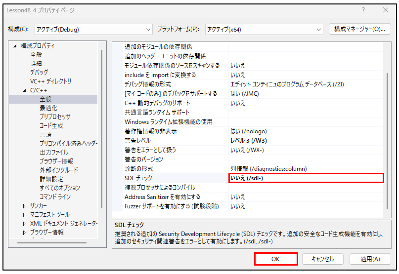 「SDLチェック」を「いいえ」にして、プログラムを実行します。