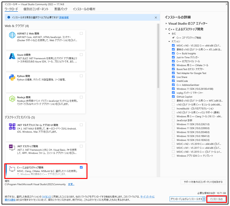 「C++によるデスクトップ開発」にチェックを入れて、「インストール」をクリックします。