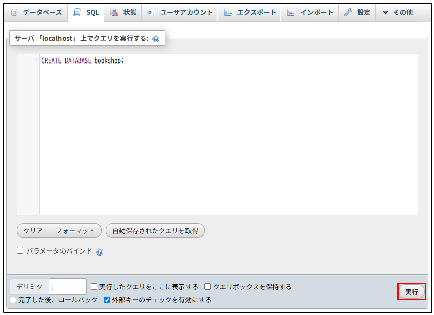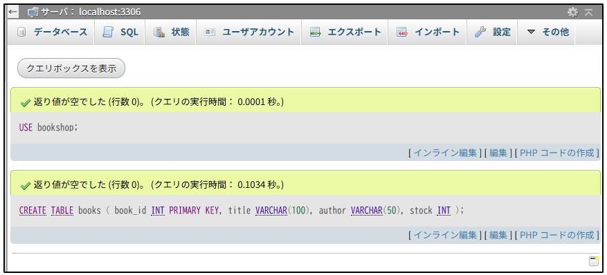 | データベース作成 | CREATE DATABASE bookshop; | 新しいデータベースを作成 |