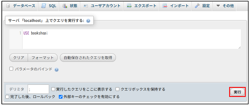 USE(データベース名);デフォルトデータベースを「bookshop」にします。