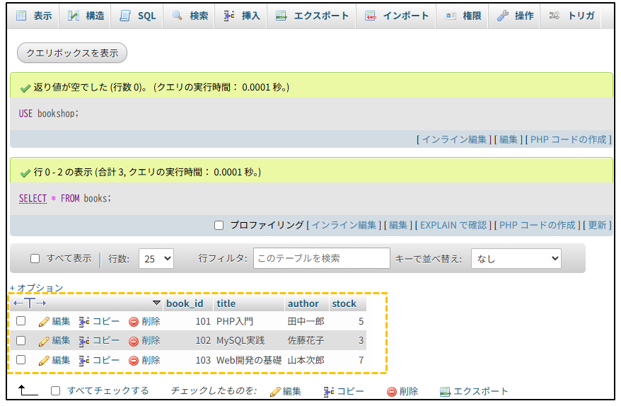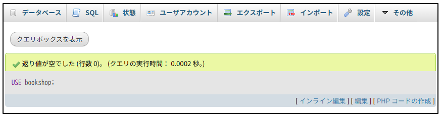 | データベース選択 | USE bookshop; | 操作対象のデータベースを指定 |