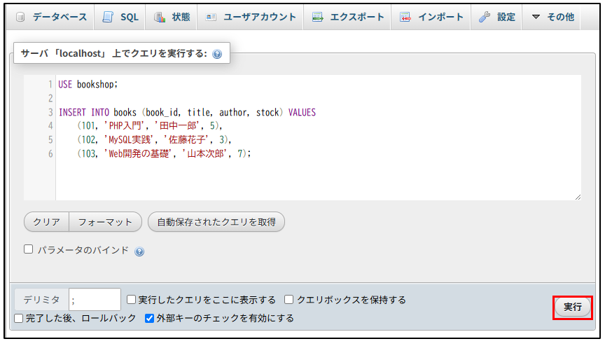 「クエリボックス」に以下のSQLクエリを入力して「実行」ボタンをクリックします。