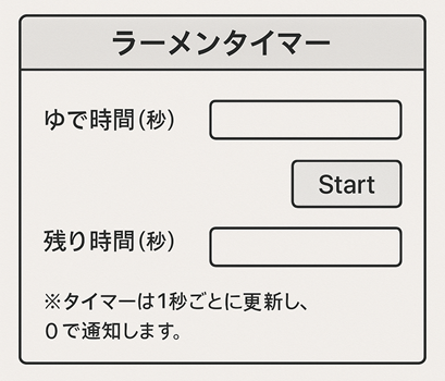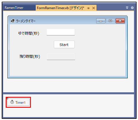 ここまで整えば、次章「④コードの実装と実行:ラーメンタイマーアプリの完成」で 「ButtonStart.Click」 と 「Timer1.Tick」 のイベントハンドラーを実装し、通知メッセージ(例:「麺がゆで上がりました!お好みの固さでどうぞ。」)を表示できるようにします。