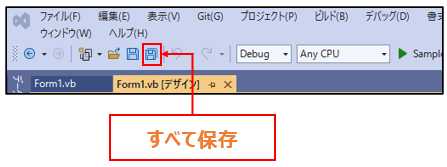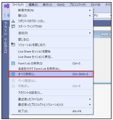 Visual Studioでは、メニューバーの【ファイル】から「すべて保存」を選択することで、開発中のプロジェクトと関連ファイルをまとめて保存できます。ショートカットボタン「すべて保存」を使っても同様です。