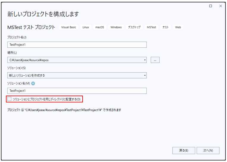 | チェックを入れる | ソリューションファイル(.sln)、プロジェクトファイル、ソースコードが同じ場所に保存される。 |