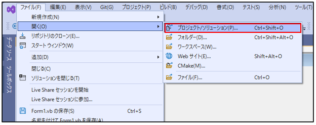 | [ファイル]メニューから開く | [ファイル]→[開く]→[プロジェクト/ソリューション]で.slnファイルを選択 |