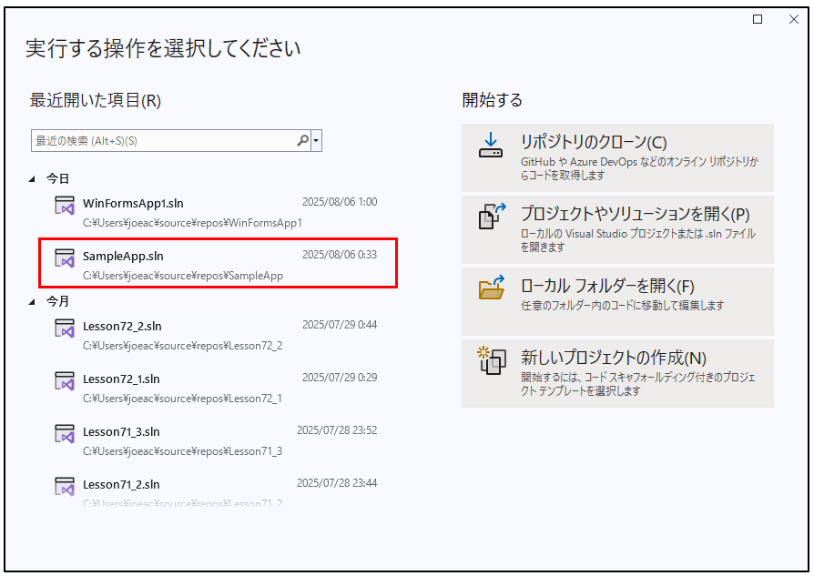 保存したプロジェクトやソリューションは、いくつかの方法で再び開くことができます。
