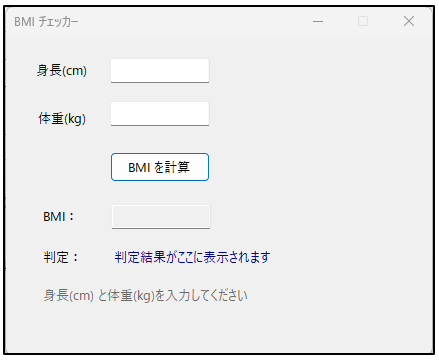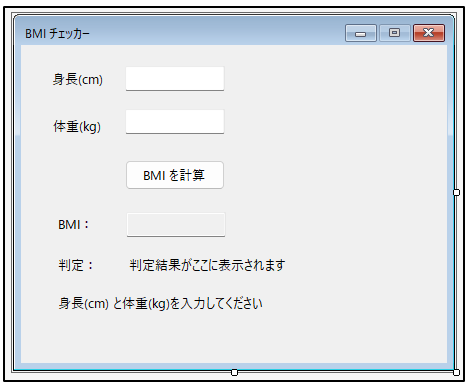 タイトルFormMainFormBMI チェッカーStartPosition=CenterScreen, FormBorderStyle=FixedDialog, MaximizeBox=False