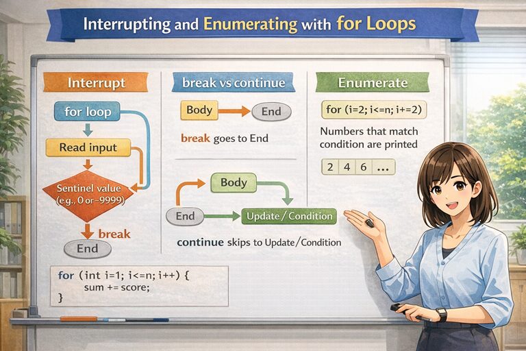 C言語基礎|for文による繰り返しの中断と列挙
