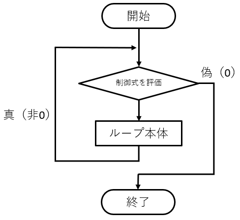 ループを終了するこの「ループ本体を実行したら、次の判定へ戻る」流れの中で、