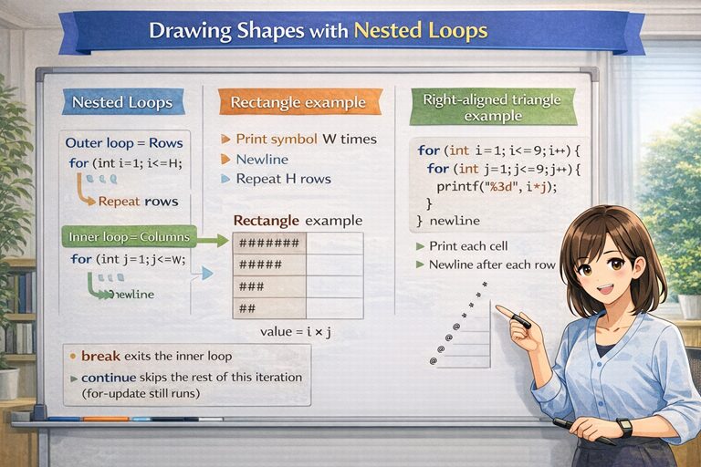 多重ループ(入れ子ループ)は、行(縦)と列(横)を同時に扱えるので、九九表みたいな「表」だけじゃなく、長方形・三角形などの図形も作れます。