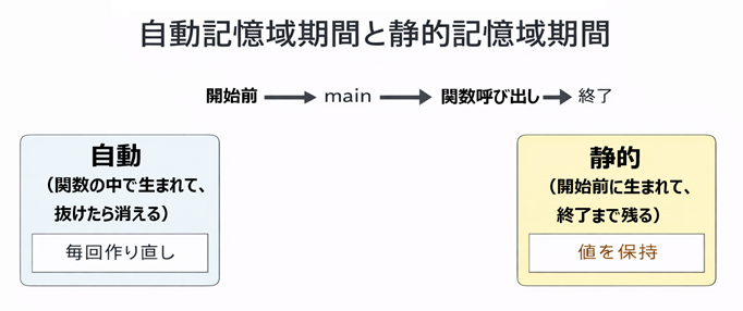 有効範囲(scope)が「名前が通用する範囲」だったのに対して、記憶域期間は「実体が生きてる期間」です。