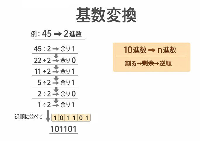 この「逆順になる」は基数変換の鉄板ポイントなので、覚えておくと強いです。