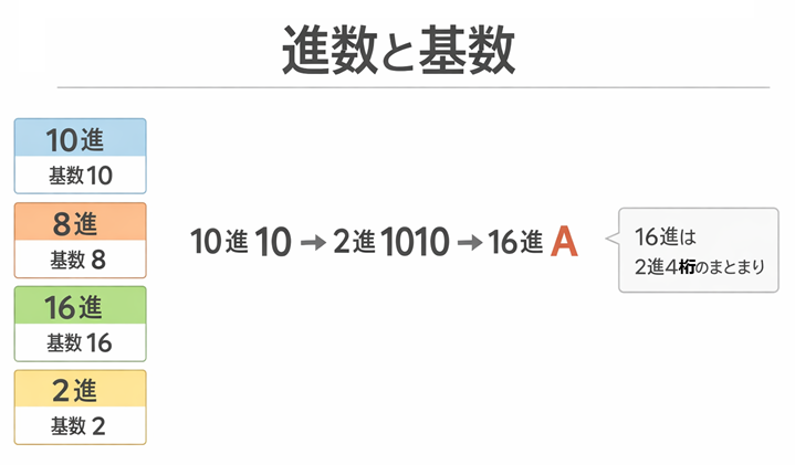 | 16進数 | 2進数4桁ごと | 4ビット(1ニブル)を1桁で表せる。 |