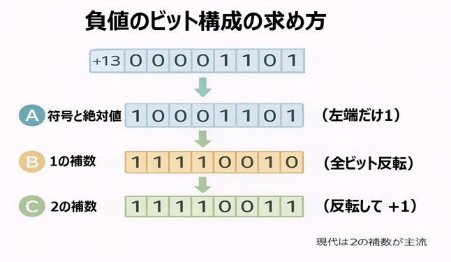| 方式 | 変換のやり方(正値のビット列から) | −13 の結果(8ビット例) | 特徴 |