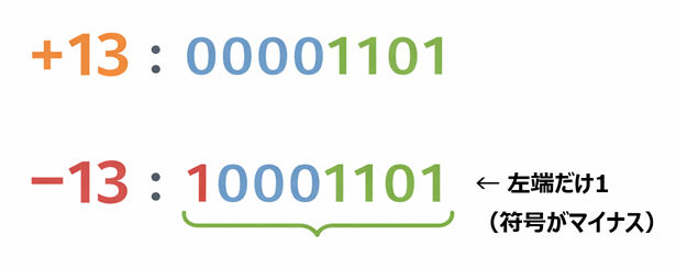 ここでは +13 → −13 を、プログラムで 8ビットの見た目として確認します。