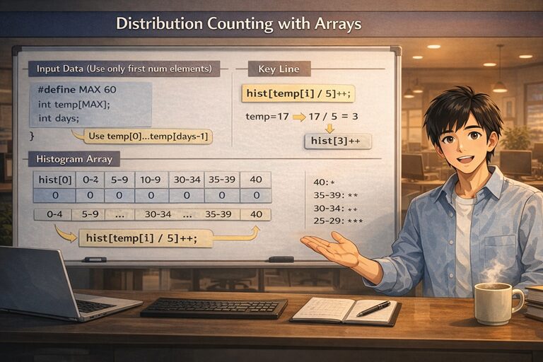 こういう “集計用の配列(カウンタ配列)” を作ると、配列の面白さが一気に広がります。