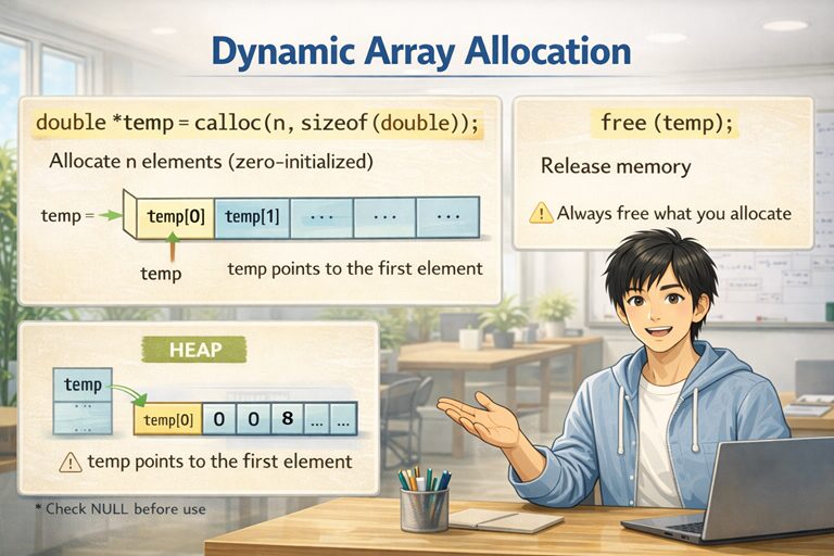 | 動的配列(callocなど) | int *a = calloc(n, sizeof(int)); | 実行時 | ヒープ(借りる領域) | 必須(freeで返す) |