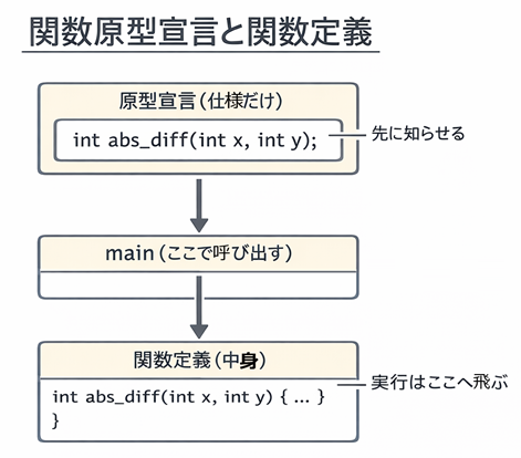 | B:原型→main→定義 | 原型宣言 → main → 関数定義 | 必要 | main を先に読めて全体像が早い | 仕様変更時に原型と定義の両方修正が必要 |