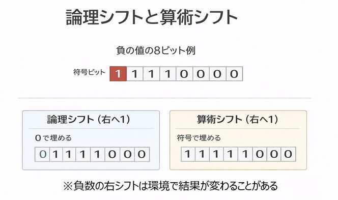 同じ右シフトでも結果が変わる!?論理シフトと算術シフトで“負数のビットの動き”をスッキリ整理しよう。