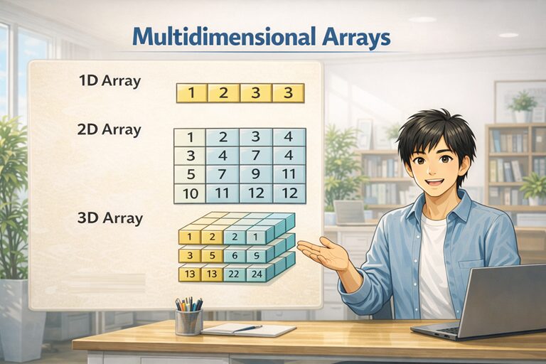 ここでは「2次元配列の考え方」と「C言語での並び方(メモリの連続配置)」を、図と表でしっかり固めます。