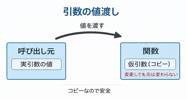 最初は「え、じゃあ関数の中で書き換えても意味なくない?」って思うかもしれませんが、実はこれが“安全”で“分かりやすい”設計なんです。