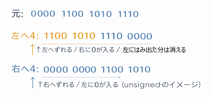 - ただし、左に押し出されたビットは消えるので、情報が失われます(これがオーバーフローや桁あふれの感覚につながります)。
