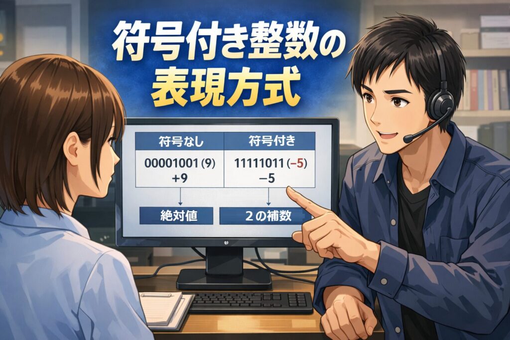 この記事では、まず「符号ビット」という共通ルールを押さえ、次に 3方式の値の範囲と並び方を表と図で整理していきます。