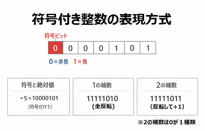でも 符号付き整数は、負の値をどう表すかで流派が分かれます。