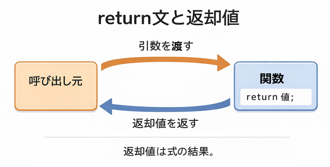 return文は、関数を終わらせるだけじゃなくて、呼び出し元へ値(返却値)を持ち帰る役目を持っています。