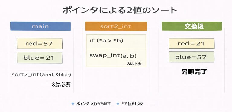 • 関数 sort2 は、呼び出し元の変数を変えたいので 住所(ポインタ) を受け取る。