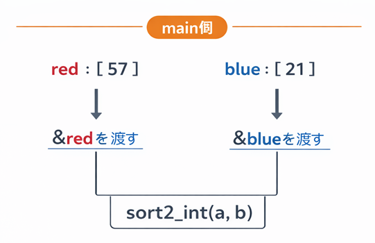main → sort2_intred の住所、blue の住所sort2_int(&red, &blue)sort2_int は住所が欲しい
