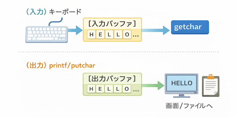 読み込んだ文字や、出力する文字をいったん バッファ(ためる箱) に入れて、一定のタイミングでまとめて動きます。