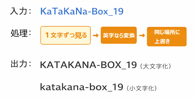ここでは、文字列を先頭から順に走査して、英字だけを変換する方法を学びます。