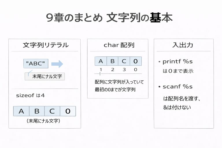 9章では、文字列は単なる文字の集まりではなく、ナル文字(値0)を終端の合図にした char 配列として扱う、というC言語らしい世界を学びました。