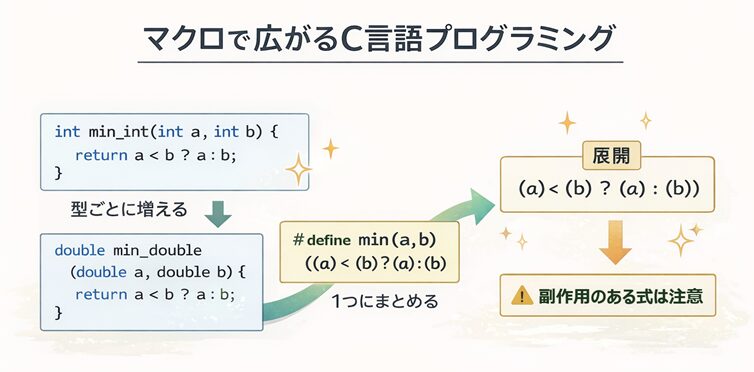 これは「関数っぽい形で呼び出せるのに、実体は置換・展開でできる」仕組みです。うまく使うと、同じ書き方で複数の型に対応できて、プログラムの見通しがグッと良くなります。