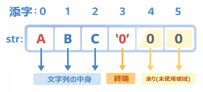 - 文字列として意味を持つのは \0 の直前まで(この例だと ABC の3文字)