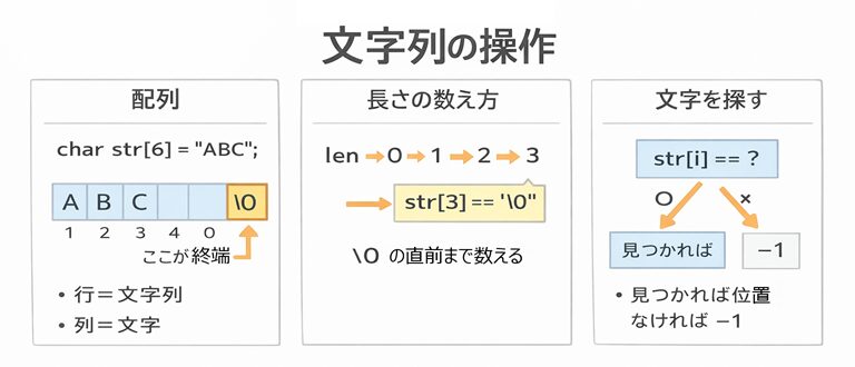 こういう「文字列の操作」は、C言語では ナル文字 \0 を目印に、先頭から順に走査するのが基本になります。