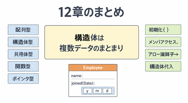 12章では、構造体を通して「データをどうまとめるか」「どう扱うか」を、かなり実戦的に学びました。