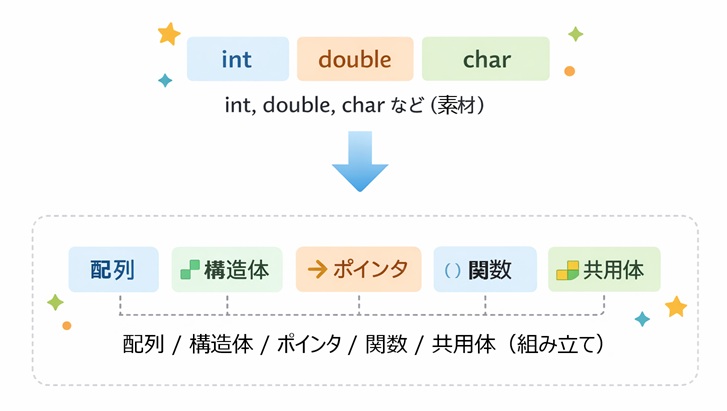 基本型(int や double など)を素材にして、C言語は色々な型を組み立てられます。これが派生型です。