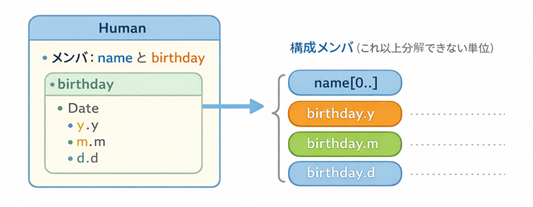 | まとまりを保つ | 人(名前・誕生日)を1つの構造体にする | 関連が壊れにくい、読みやすい |