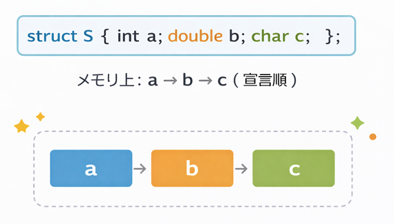 構造体のメンバは、基本的に宣言した順番でメモリに並びます(細部はアライメントの影響あり)。