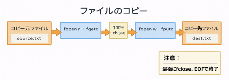 - fgetc が読む、fputc が書く、という“左右対称”な構造です。