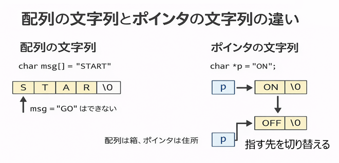 配列の文字列は「文字が入った箱(固定された領域)」、ポインタの文字列は「どこかにある文字列の先頭を指す住所札(付け替え可能)」というイメージ。