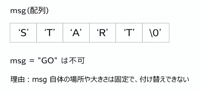 配列 msg は「固定された箱」です。箱そのものを別の箱に付け替えるような代入 msg = "GO" はできません。