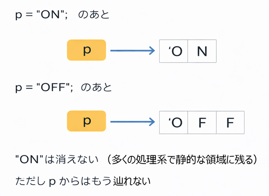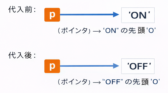 p = "OFF"; // OK:ポインタが指す先を付け替えるだけ
