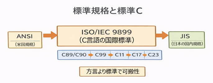 | C89 / C90 | 最初の本格的標準(ANSI→ISO) | 以後の基準になる“土台” |
